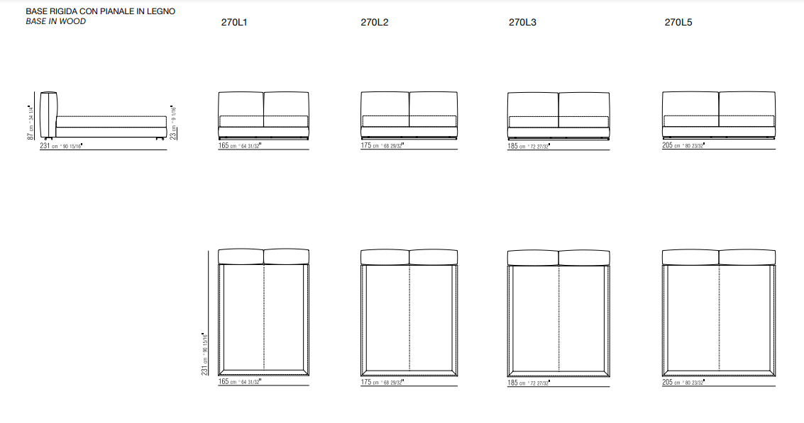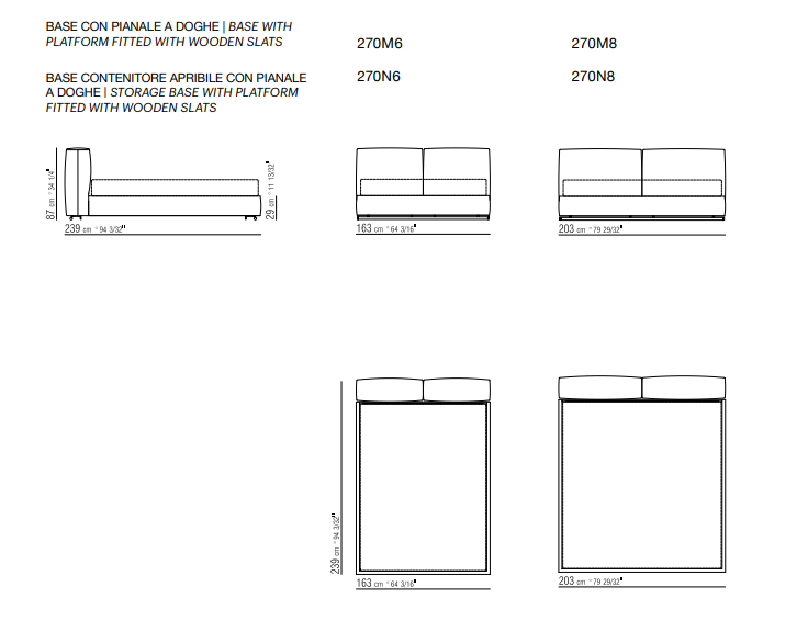 The Asolo bed rests on a sleek metal base and comes in a number of sizes and different variations: with base composed of a single perimeter frame; rigid base; platform base with height-adjustable slats; and base with storage compartment, handy for storing pillows, blankets and bed linens.