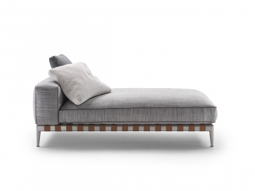 The Gregory chaiselongue’s personality is evident in the austerity of the unique metal base that is softened by the warmth of the elegant cowhide finish on the exposed parts of the elastic webbing that supports the seat cushions.