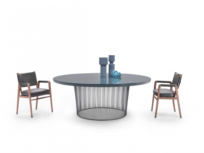 Many unique combinations can be achieved with the finishes available for the dining table. Its impressively thick top comes in Canaletto walnut or ash veneer, in an array of different shades, or with glossy lacquer finish in a sophisticated palette of colors.