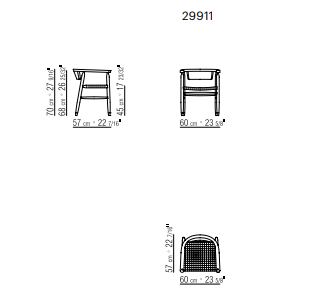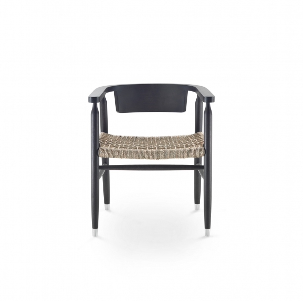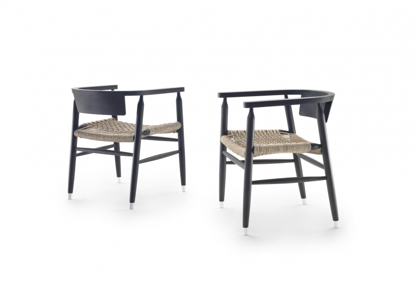 The design is stripped down to the bare bones: four legs in solid ash turned and finished by hand, a single half-moon shaped element that joins the backrest and armrests to a hand-woven cord seat.