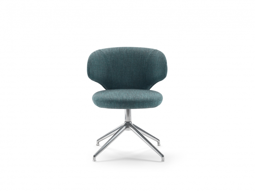 Slender and sleek, the Susanne small armchair sits on a metal stationary or swivel base.