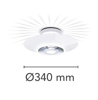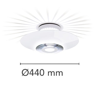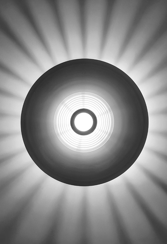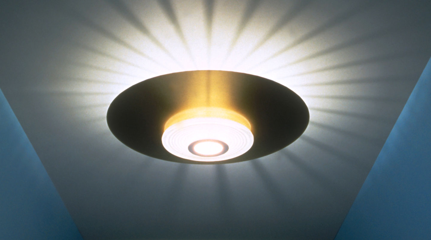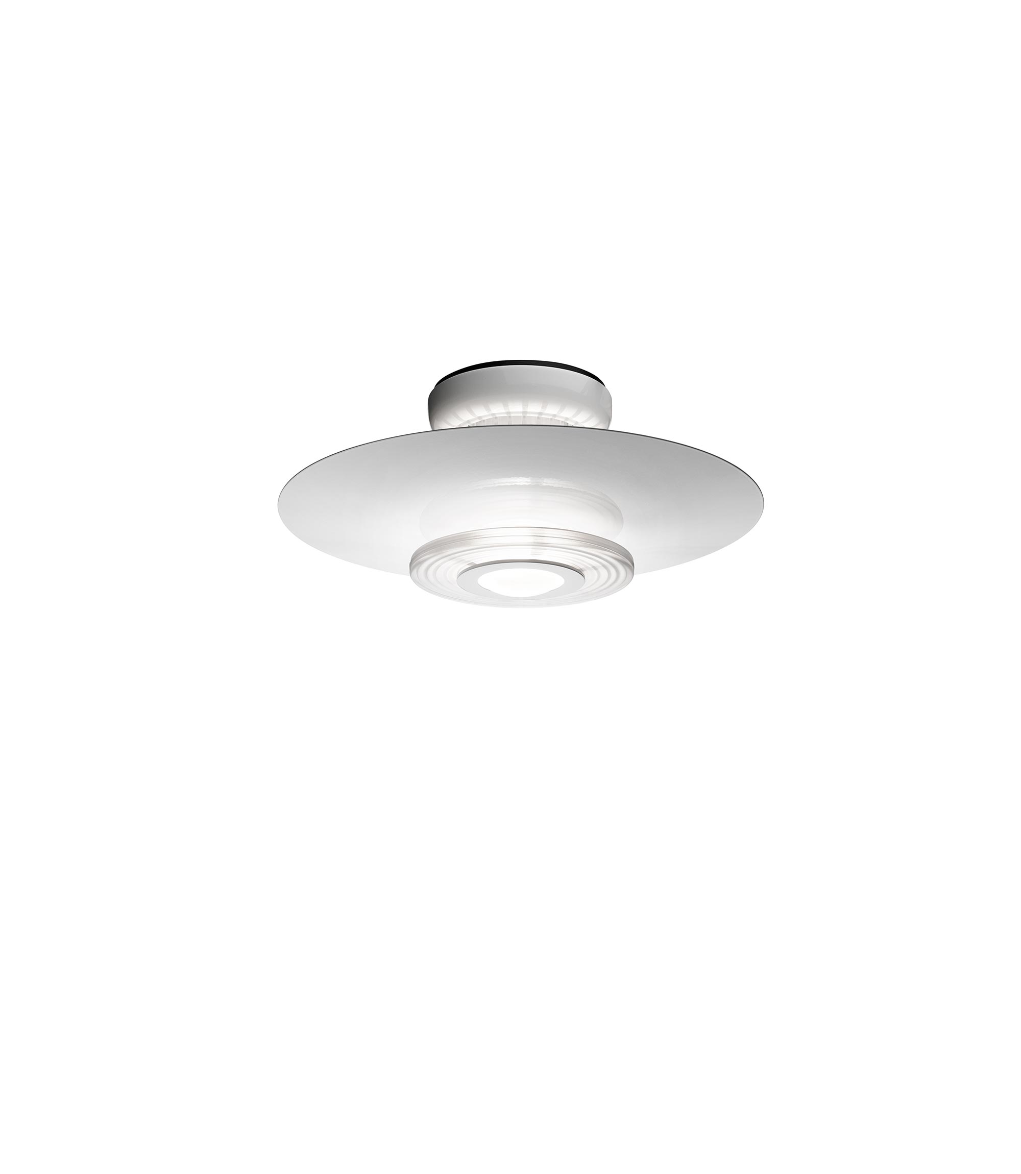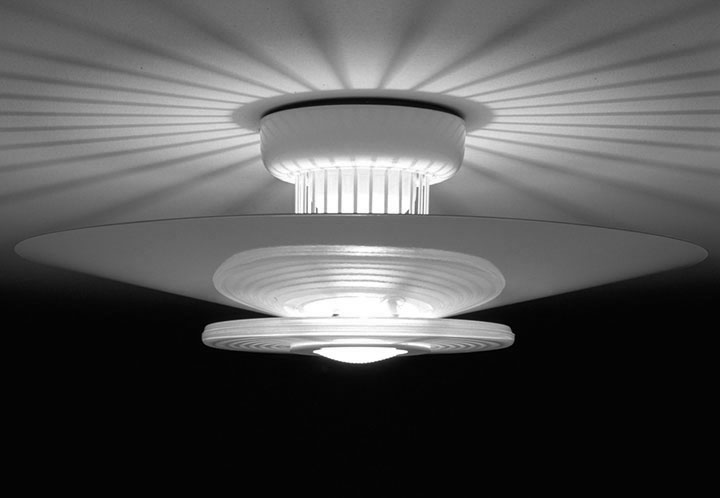 Ceiling fixture providing reflected and diffused lighting. Gloss white powder-coated pressed aluminum reflector. Equipped with special pressed steel support providing a radial starburst pattern. Front shade consists of sand-blasted molded glass and a molded clear glass lens. Matte black painted die-cast aluminum ceiling fitting and gloss white powder-coated pressed aluminum rose.