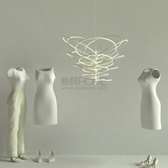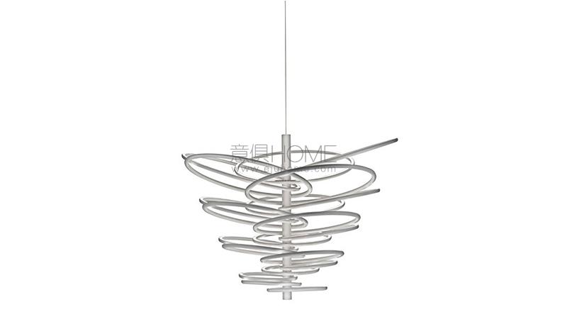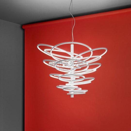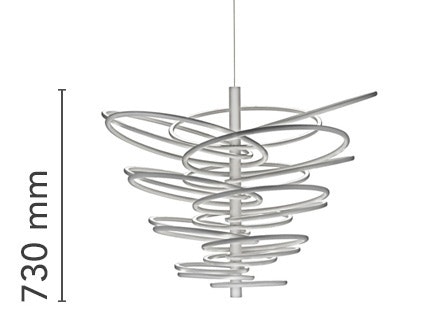 Hanging lamp with indirect light. Stem and rings are in aluminium. The diffuser is in double satinized methacrylate. The power cable and the steel cable are 4 metres long. The power supply can be dimmed. The ceiling rose is covered with a mirrored disc.