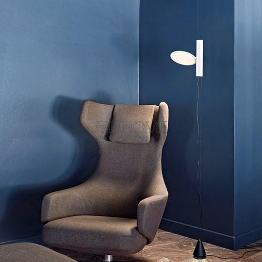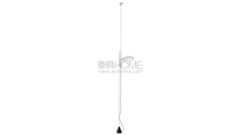 Lamp providing direct light. Head in gloss varnished or chromed die-cast aluminium. Body in injection-stamped PA66+30%FV with cover in gloss varnished or chromed die-cast aluminium. Orientable head. The light fitting can be moved vertically by running the internal structure of the body on a steel cable tensioned between the ceiling and the floor (useful length 4000mm). Dimmable switch with Soft Touch technology. Adaptor on plug connector with interchangeable plugs.