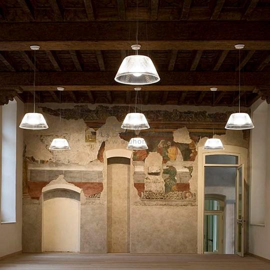 Suspension lamp providing diffused light. Acid-etched pressed borosilicate glass internal diffuser. Pressed clear glass shade. Injection-molded transparent polycarbonate diffuser support. Transparent, stamped polycarbonate dust protection screen. White, injection-molded ABS rose, galvanized pressed steel ceiling fitting. Free steel suspension cable.