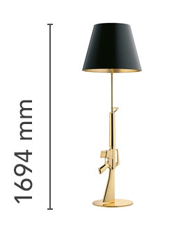 Floor lamp providing direct reading and ambient lighting. Body is die cast aluminum with an overmolded polymer coating and gloss 18K gold plated or chrome finish. Matte black plasticized paper shade with an internal gold silkscreened or white with an internal silver silkscreened. On the cable there is the electronic dimmer which allows the regulation of light brightness.