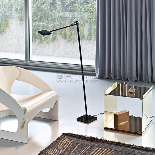 Floor lamp. Head in pressofused aluminium, diffuser in PC. Power pack on plug, base cover in injection printed PC, counterweight in iron cut and painted by means of a cataphoresic process. Directionable head. Three-step ON/OFF switch with Soft Touch technology. Base separated from the lamp body with safety locking pin.