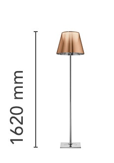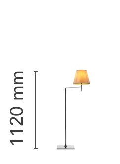 Floor lamp providing diffused lighting; a switch located near the diffuser allows for 4-level light adjustment via a "remote? dimmer positioned on the power cord near the plug. Base and rod support in die-cast, polished and chrome-plated Zamak alloy. Rod, arm support, arm and diffuser support in polished aluminum tube. Molded steel counterweight with galvanized finish. Injection-molded PC (polycarbonate) inner diffuser opal color. Outer diffusers in transparent or fumèe PMMA (polymethylmethacrylate) and silver or bronze on the inner surface, by vacuum aluminum coating. Injection-molded PC (polycarbonate) upper ring, completely transparent, or transparent brown for the outer bronze diffuser.