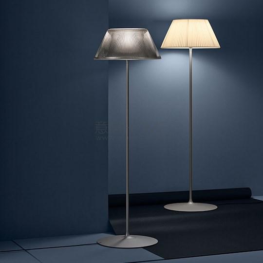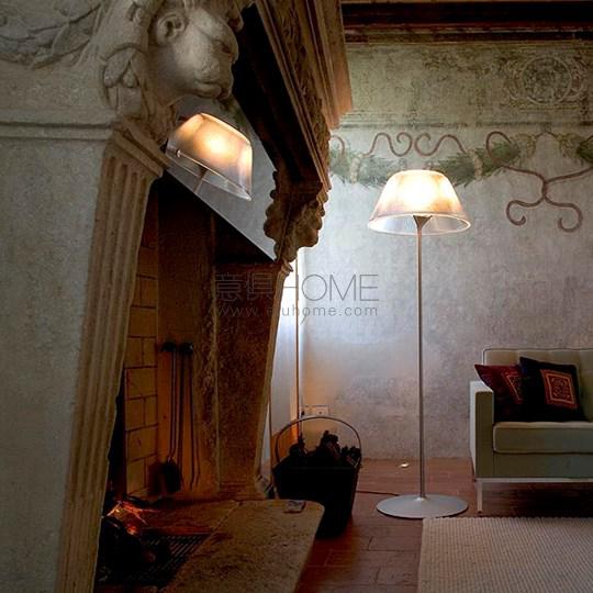 Floor lamp providing diffused light. Acid-etched pressed borosilicate glass internal diffuser. Pressed clear glass shade. Gray painted steel stem and die-cast aluminum base and yoke. Injection-molded transparent polycarbonate diffuser support. On the cable there is the electronic dimmer which allows the regulation of light brightness.