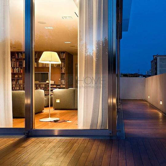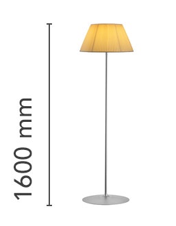 Floor lamp providing diffused light. Acid-etched pressed borosilicate glass internal diffuser. Plissé cloth shade. Gray painted steel stem and die-cast aluminum base and yoke. Injection-molded transparent polycarbonate diffuser support. On the cable there is the electronic dimmer which allows the regulation of light brightness.