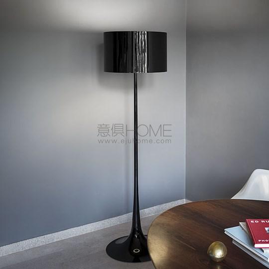 Floor fixture providing diffused lighting. Spun metal frame and diffuser, die-cast aluminum diffuser support arms and lamp-holder support, painted in the colors indicated below. White, injection-molded polycarbonate diffuser supports. On the cable there is the electronic dimmer which allows the regulation of light brightness.
