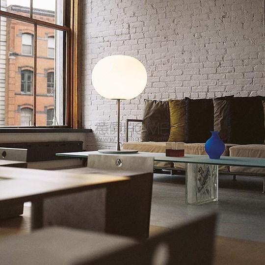 Table/desk lamp providing diffused light. Diffuser consisting of an externally acid-etched, hand blown, flashed opaline glass and a die-cast threaded ring nut with alodine plating finish. Gray or black painted high-thickness steel base and stem and die-cast aluminum diffuser support. On the cable there is the electronic dimmer which allows the regulation of light brightness.
