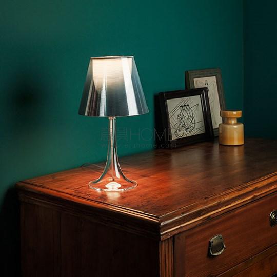 Table lamp providing diffused light. Fully transparent, injection-molded PMMA polymethylmethacrylate frame; opaline, injection-molded polycarbonate internal diffuser and injectionmolded transparent or colored polycarbonate external diffuser completely finished with high-vacuum aluminization process.