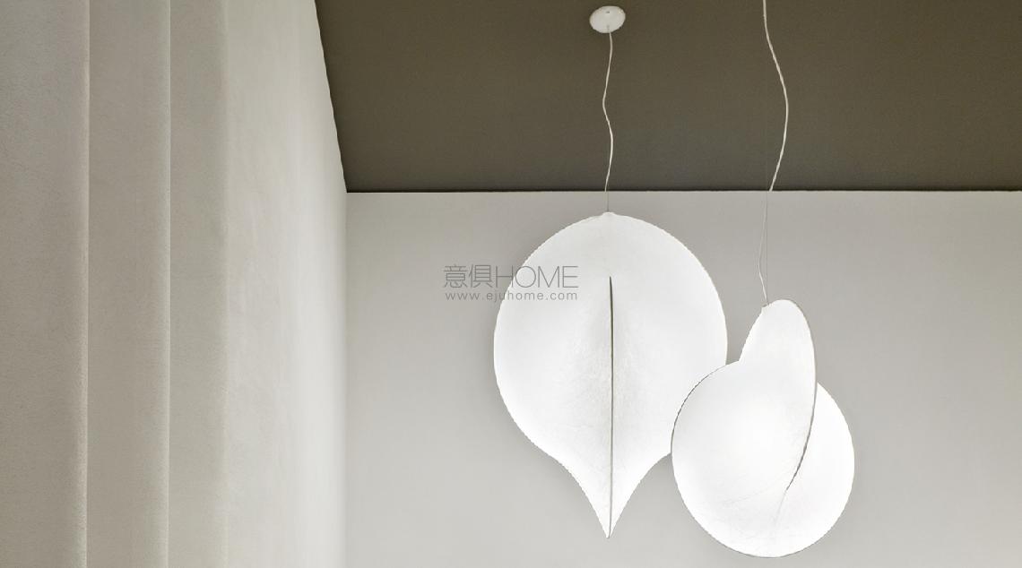 Suspended lamp with diffused light. Internal structure in white powder painted steel. Resin diffuser Cocoon sprayed on the structure, with a transparent protection created by spraying at the end of the machining, ring for substitution of printed steel diffuser in polished, Gold-plated "Galvanic" finish. Die-cast rose in Zama polished and Gold-plated "Galvanic" finish.