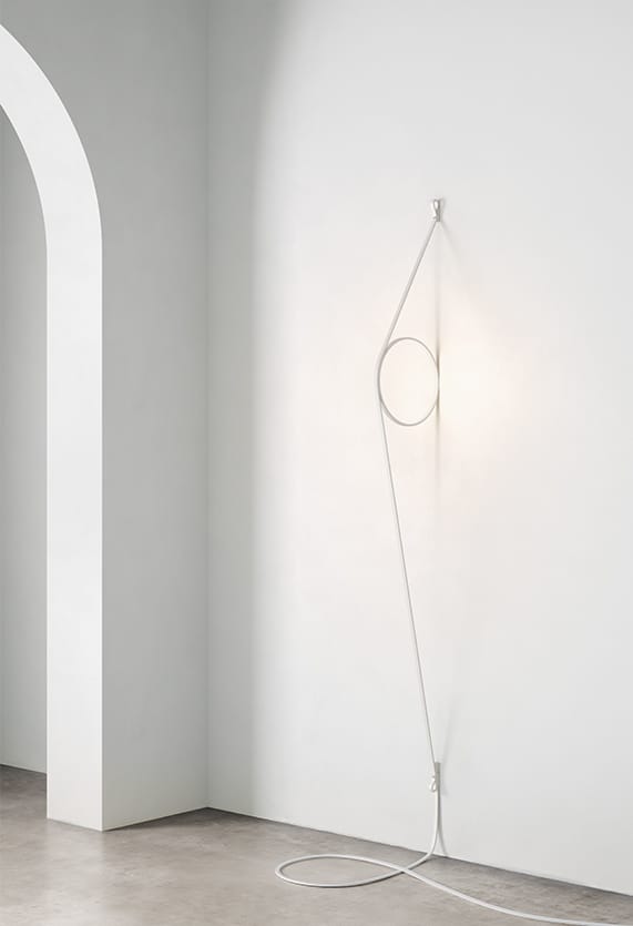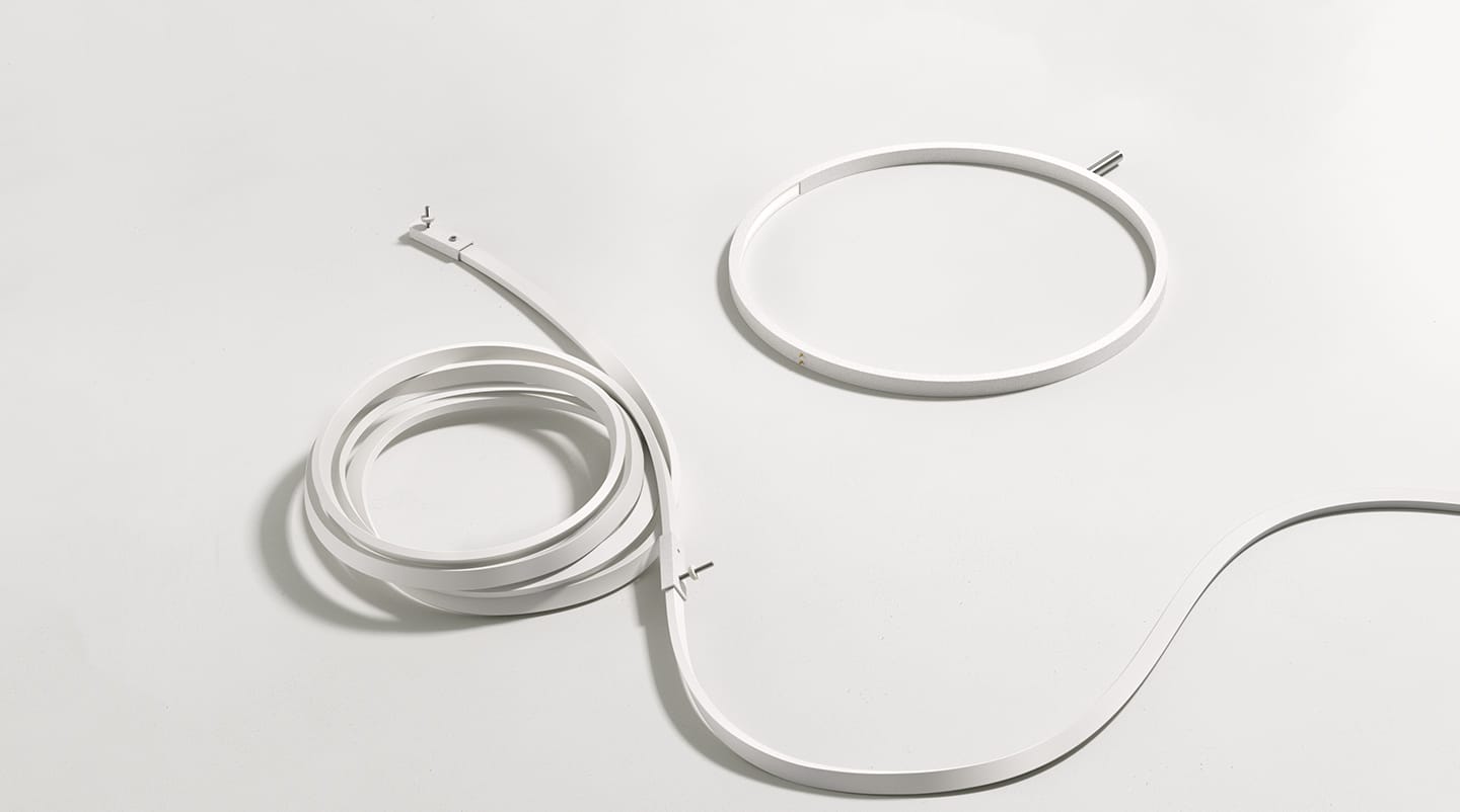 Indirect light wall lighting device with body in calendered, extruded aluminium with galvanised or varnished finish. The special tangent cable, in coloured rubber, provides the power. The cable is fixed to the wall with ABS joints in the same finish as the ring. Dimming via switch pedal on the cable. Power supply on adapter with interchangeable plugs. Useful cable length is 2.5 metres.