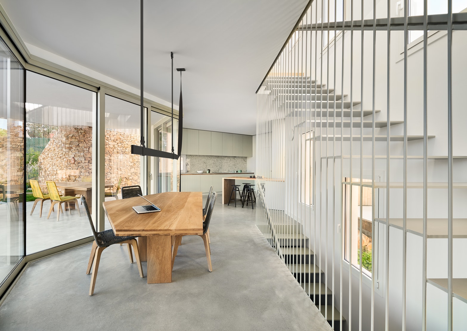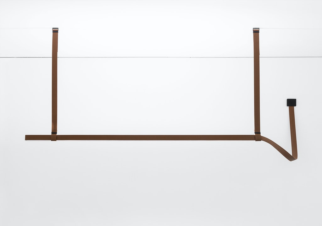 Technical lighting line covered in a fine leather cover sewn to measure that integrates all elements of the composition. The innovative connection system has been developed to achieve a sinuous line without apparent interruptions.