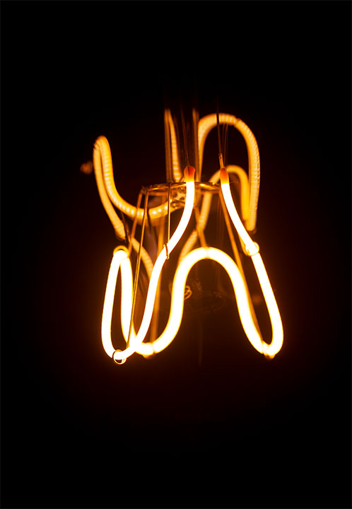 A bulb-shaped lighting unit made of blown borosilicate glass, with good shock resistance properties and excellent transparency, due to the reduced thickness of the material. The led filament is held in position by a molybdenum structure incorporated in a thin tube, also made of borosilicate, which is used in turn to extract the air and therefore prevent any internal condensation build-up. The filaments which convey the power are housed in a dedicated cable gland designed to satisfy the safety regulations and standards. The light source consists of a 225 mm long flexible micro-led filament, using customised electronics which can handle a light flow of 210 - 450 lumen, using the most common Triac dimmers. Luminous flux is in proportion to the voltage for each lighting fixture. The light temperature of 2200°K was selected to replicate that of the traditional incandescent lamp. The same applies to the high CRI (95), which guarantees a high quality standard of chromatic performance.