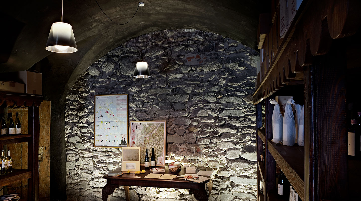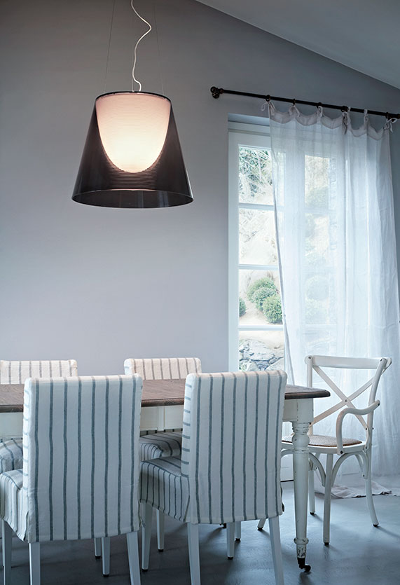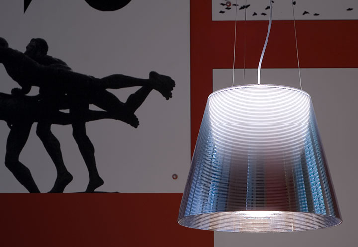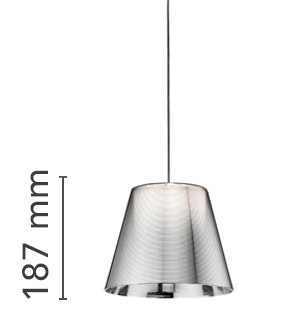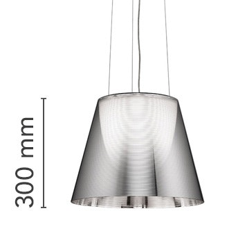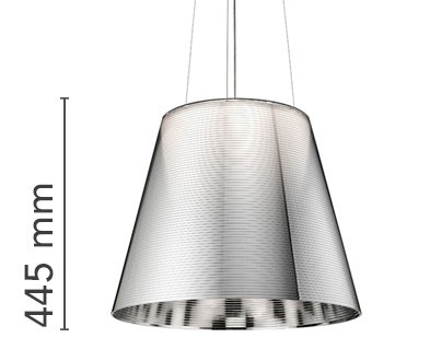 Suspension lamp providing diffused light. PC (polycarbonate) inner diffuser, with opal white finish. Outer diffusers in transparent or fumèe PMMA (polymethylmethacrylate), and silver or bronze on the inner surface, by vacuum aluminum coating. Three stainless steel cables, length 4000 mm for suspension of the diffuser assembly. White ceiling rose.