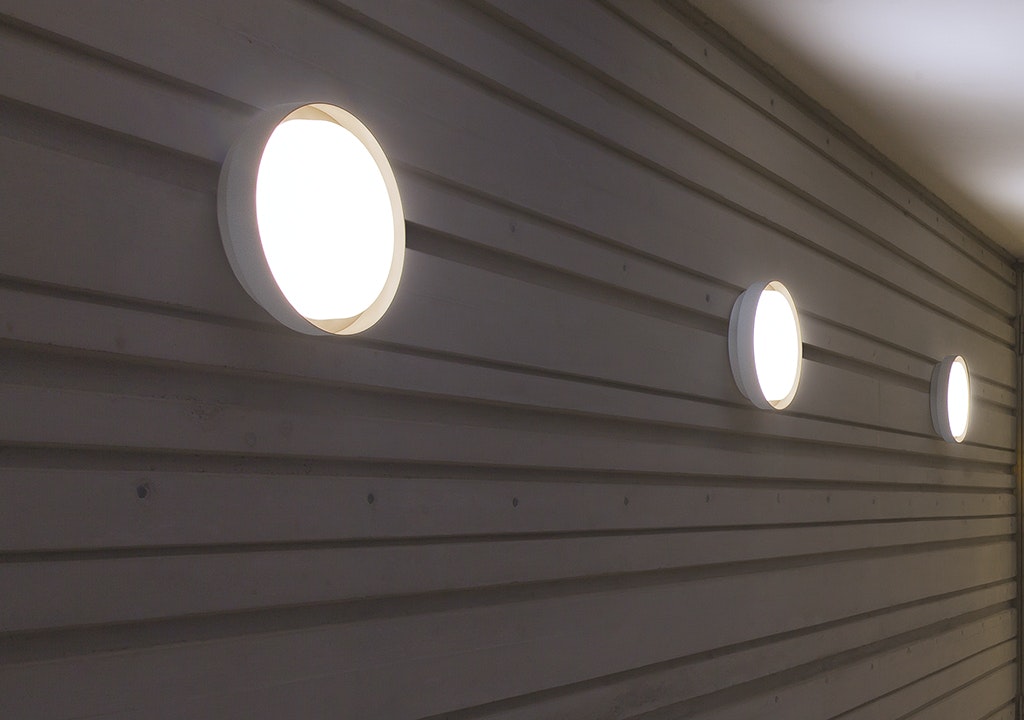 Round luminaire for rose, wall or ceiling installation, available in three sizes.