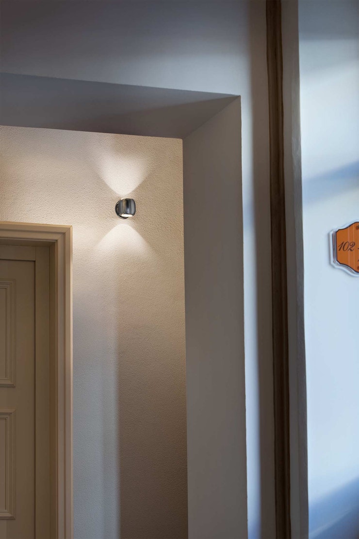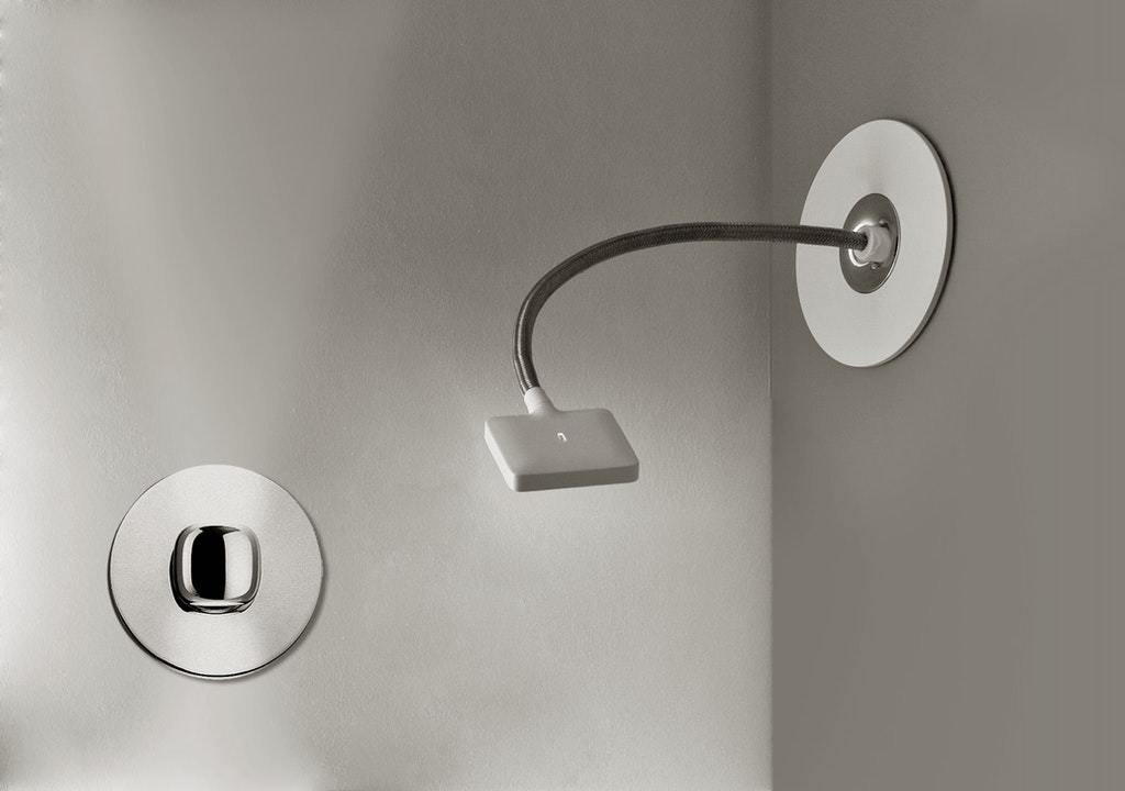 Range of small, LED lighting devices designed for wall mounting. Any of the fittings in the range can be coupled, all being extremely small in size, with the single recessed standard casing containing the lamp’s electronics.