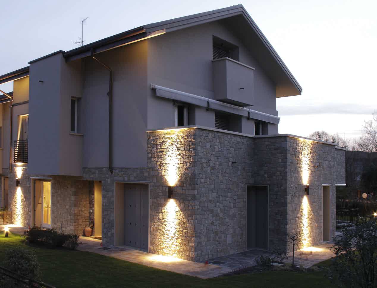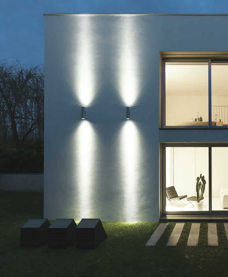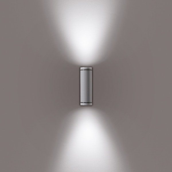Complete range of cylindrical luminaires, for wall installation, available in both mono-directional and bi-directional versions, perfect for creating contrasting accent lighting on facades and perimeters.