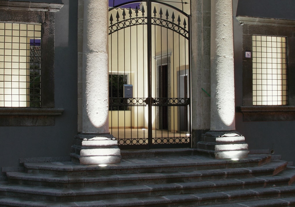 Round luminaire for ground installation, withstanding the passage of pedestrians and cars, with fixed, symmetrical or asymmetrical optics, or with adjustable optics. Die-cast aluminium body and AISI 316L stainless steel outer frame. Highly resistant, transparent or tempered sandblasted glass diffuser. Lamp holder with E27 socket for Retrofit LED light bulbs and G12 socket for metal halide lamps. Recessed box, to be ordered separately.