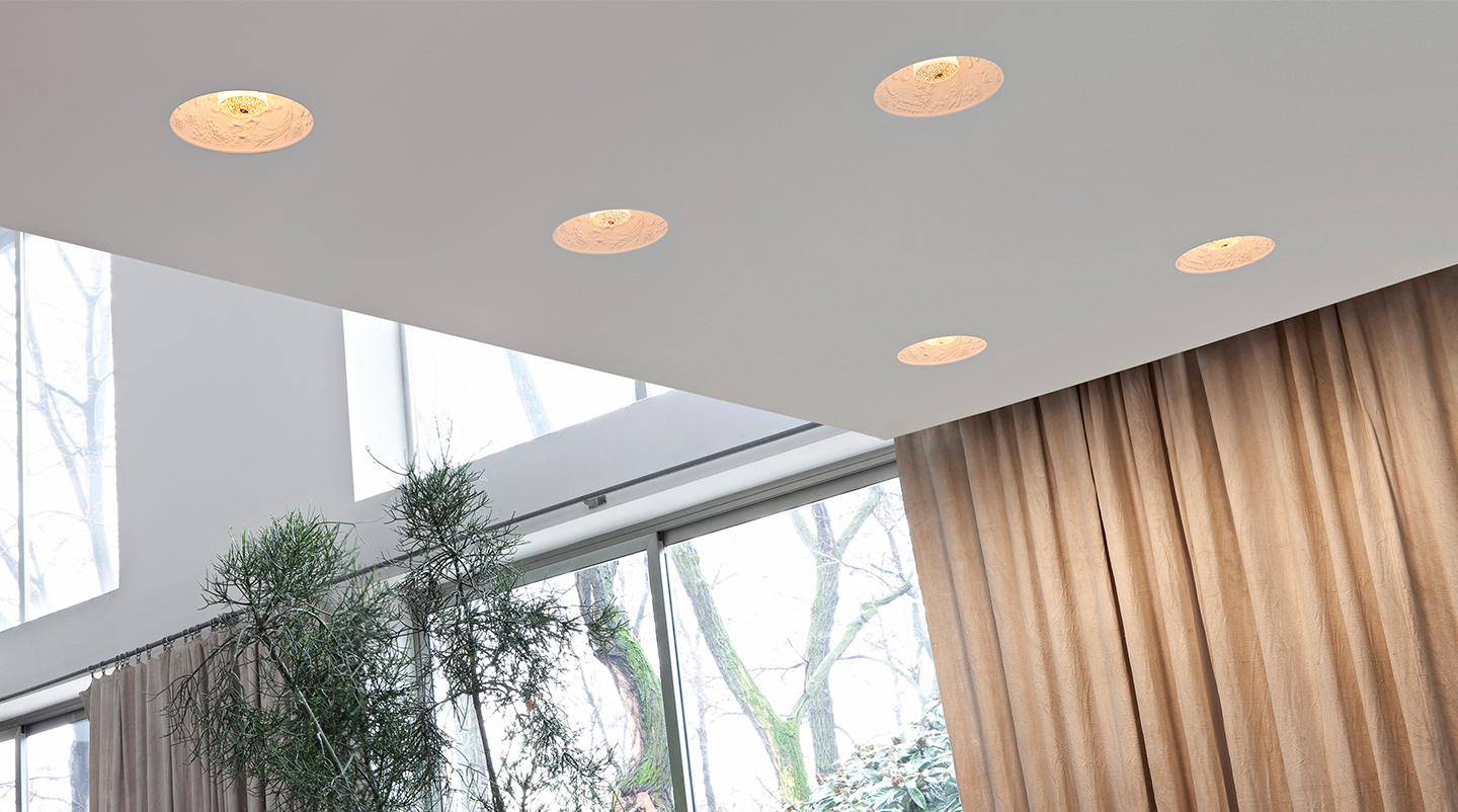 Recessed luminaire providing diffused lighting. Hemispherical, cast plaster diffuser, painted white inside. Plaster diffuser support in die-cast aluminum alloy. Flashed and blown opal glass diffuser. Frieze in photo-etched and mechanically drawn aisi 304 steel.