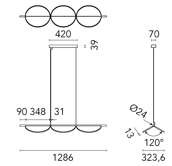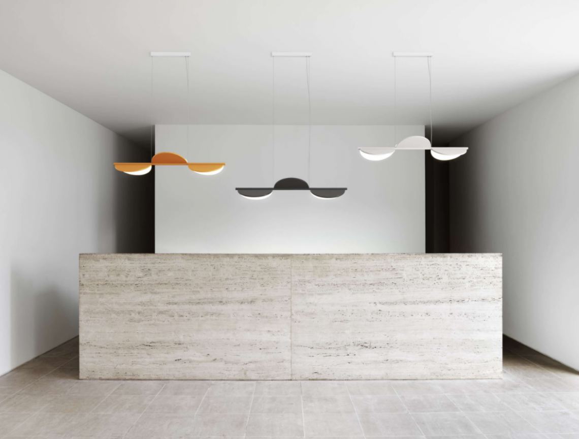 Suspension lamp with diffused light emission available in linear and organic compositions. Tubular structure made of aluminium and CNC aluminium terminals with matte or metallized finish. Edge Lighting technology integrated. Light units can be turned by steps of 60o within the structure in order to change the direction of the light emitted. Metal rosette with matte white finish. The integrated electronics in the ceiling rose allow the use of different dimming systems: 1-10V, DALI, push-dim or potentiometer. Useful length of the cable 3 mt. The product has been designed according to the ISCC standards and it is assembled with total absence of glued components so that it can be completely separated for future recyclability.