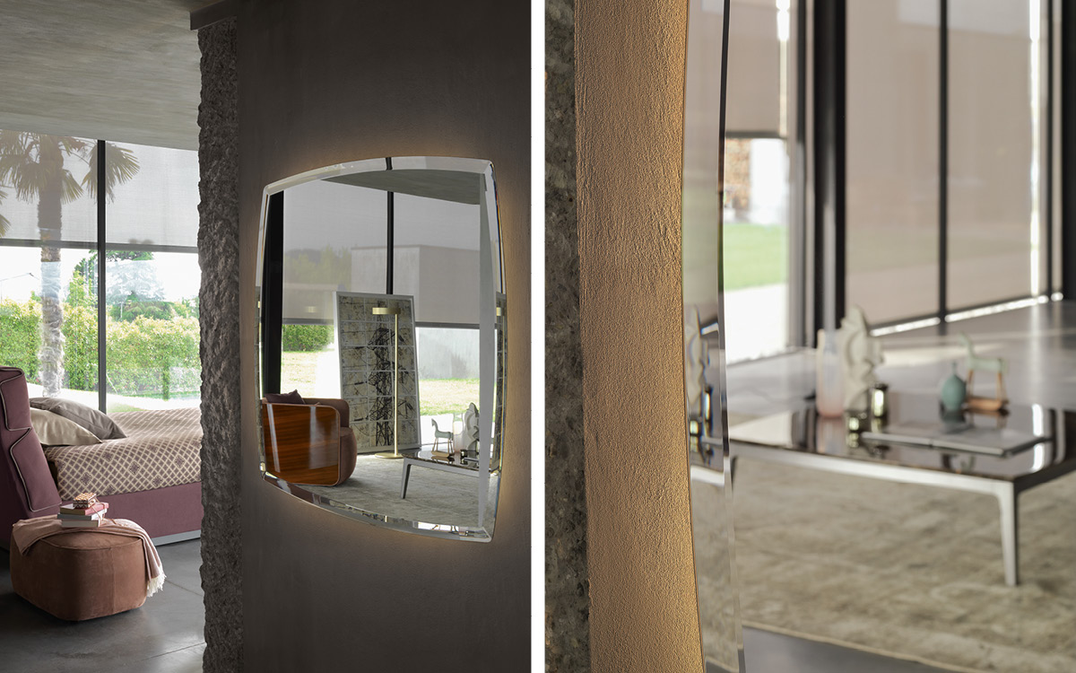 A range of crystal mirrors with a 4.5 cm bevelled edge available in  three diffff erent sizes and three diffff erent fifi nishes: natural, smoked  or bronze. An LED version is also available.