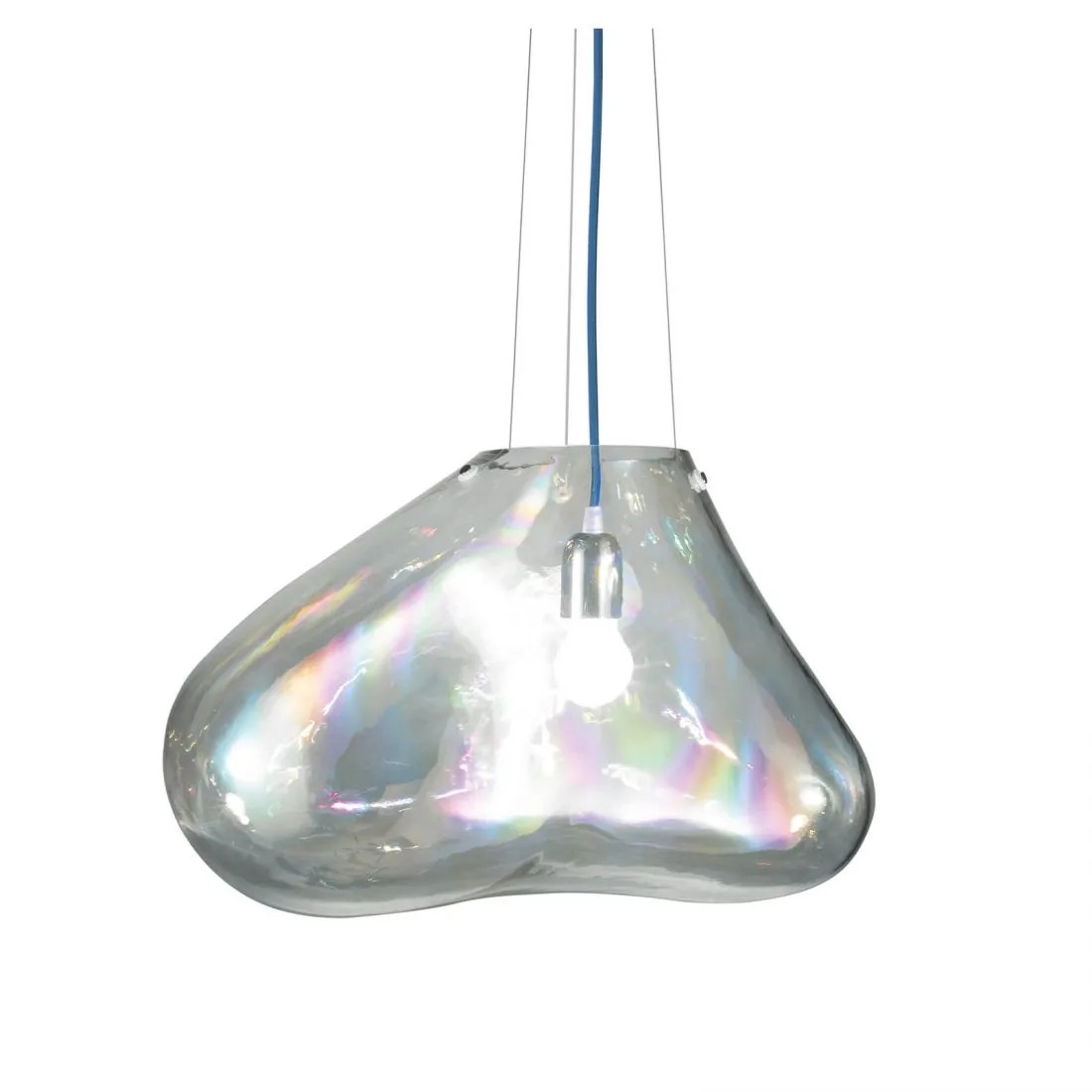 Questa lampada a sospensione si chiama Bolla perché il suo diffusore in vetro soffiato trasparente ha un effetto iridiscente che ricorda l’effetto delle bolle di sapone.