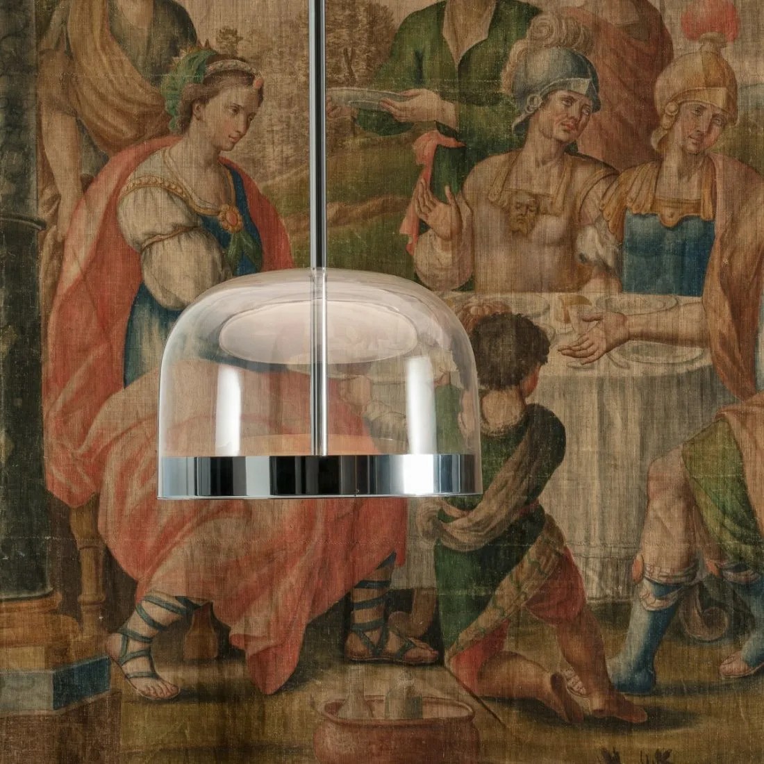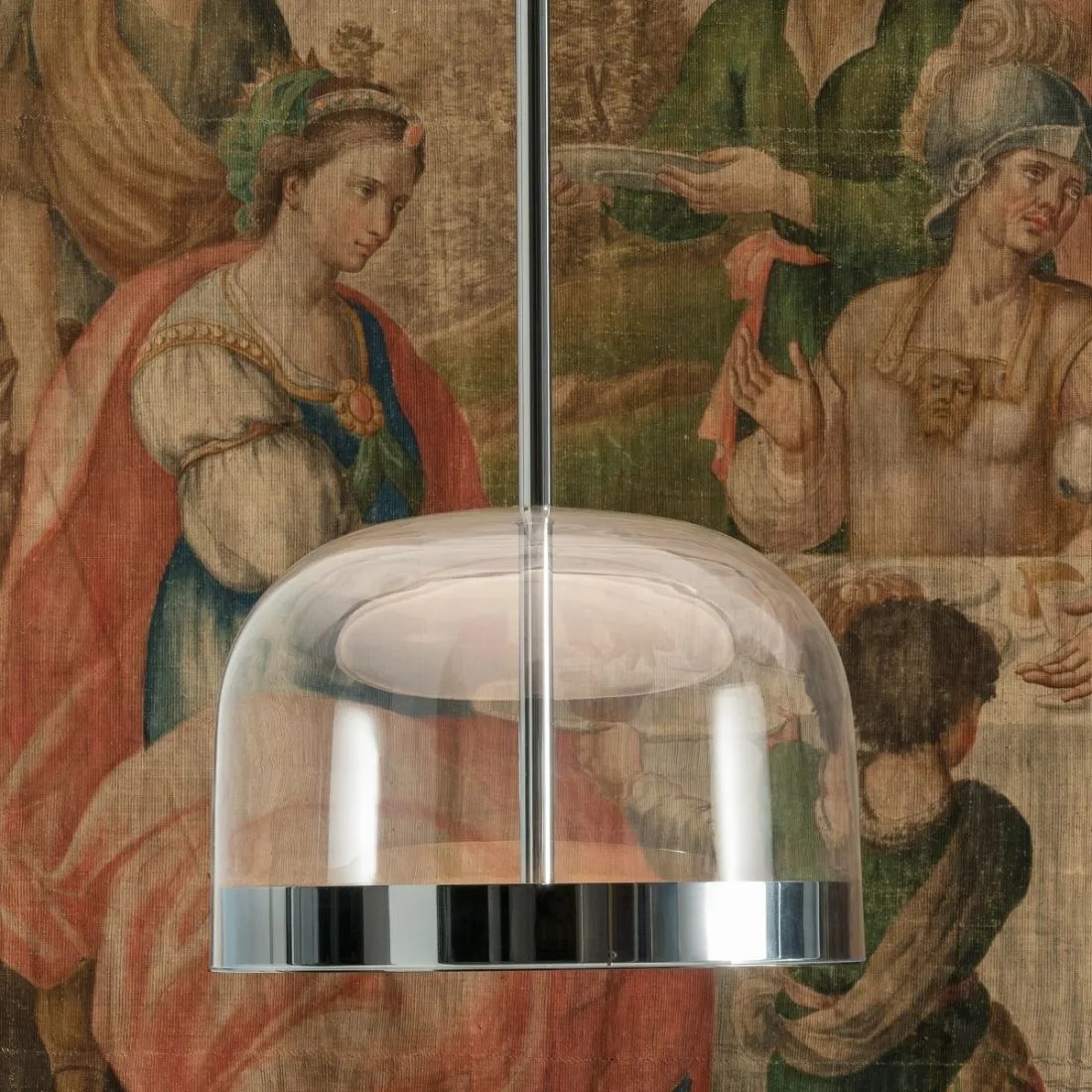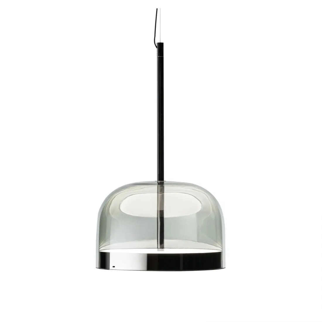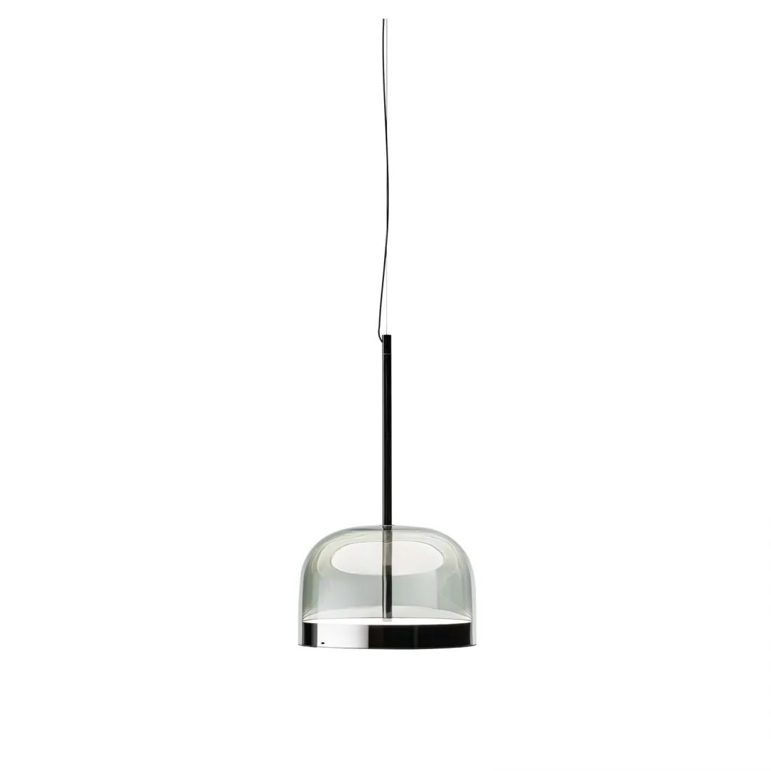 Equatore: reinterpretazione in chiave contemporanea delle classiche lampade con paralume in vetro. Se nelle tradizionali abat-jour il diffusore alloggia al suo interno la sorgente luminosa, in questa famiglia di lampade il diffusore è paradossalmente e suggestivamente vuoto e l’effetto luminoso è prodotto da due dischi luminosi all’interno di una fascia metallica centrale, visibile sul paralume e che richiama la linea dell’equatore. La luce prodotta dai Led, grazie a schermi interni disposti a strati, si distribuisce regolarmente sulla superficie dei dischi, irradiandoli magicamente di luce. Il disco inferiore produce un’emissione luminosa verso il basso, quello superiore illumina la calotta di vetro, per una diffusione morbida della luce. Disponibile da tavolo, da terra e da sospensione, in due misure, si declina in due tonalità: una più fredda, in grigio con struttura cromo scuro, e una più calda, con calotta trasparente tortora e struttura color rame.