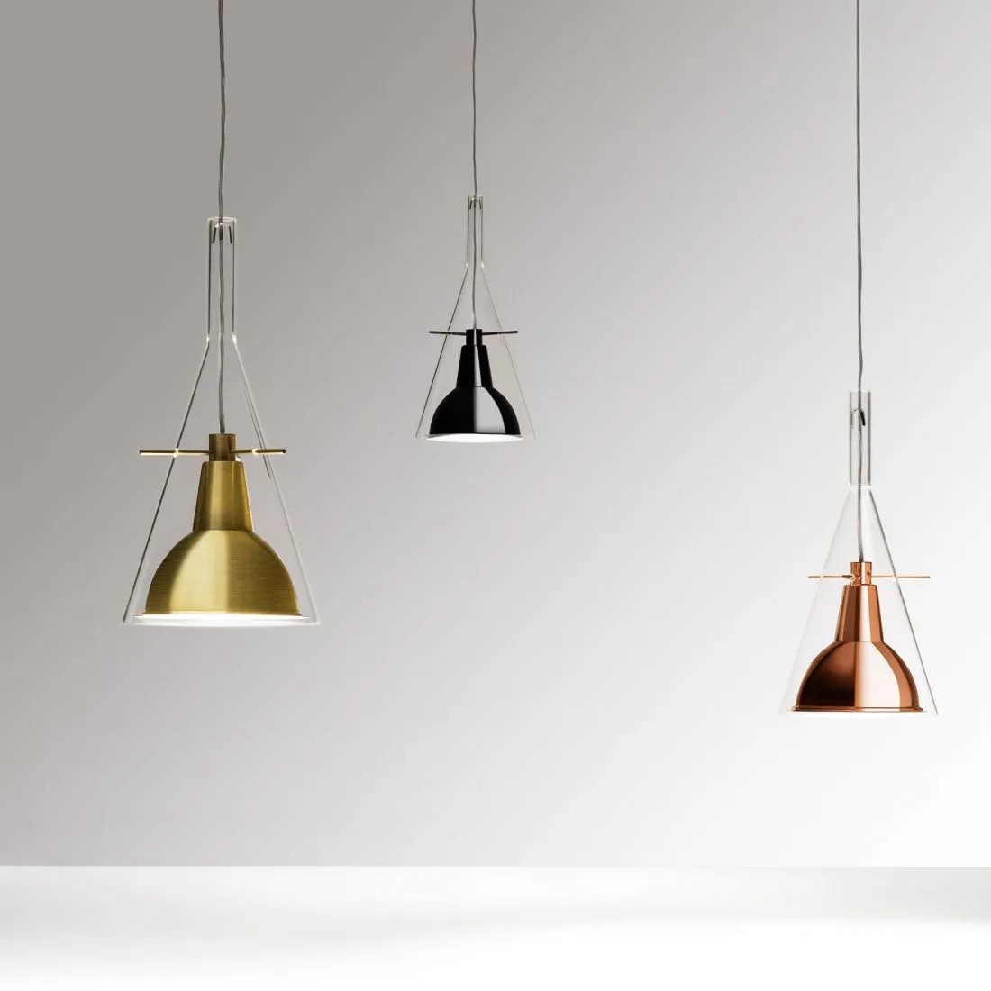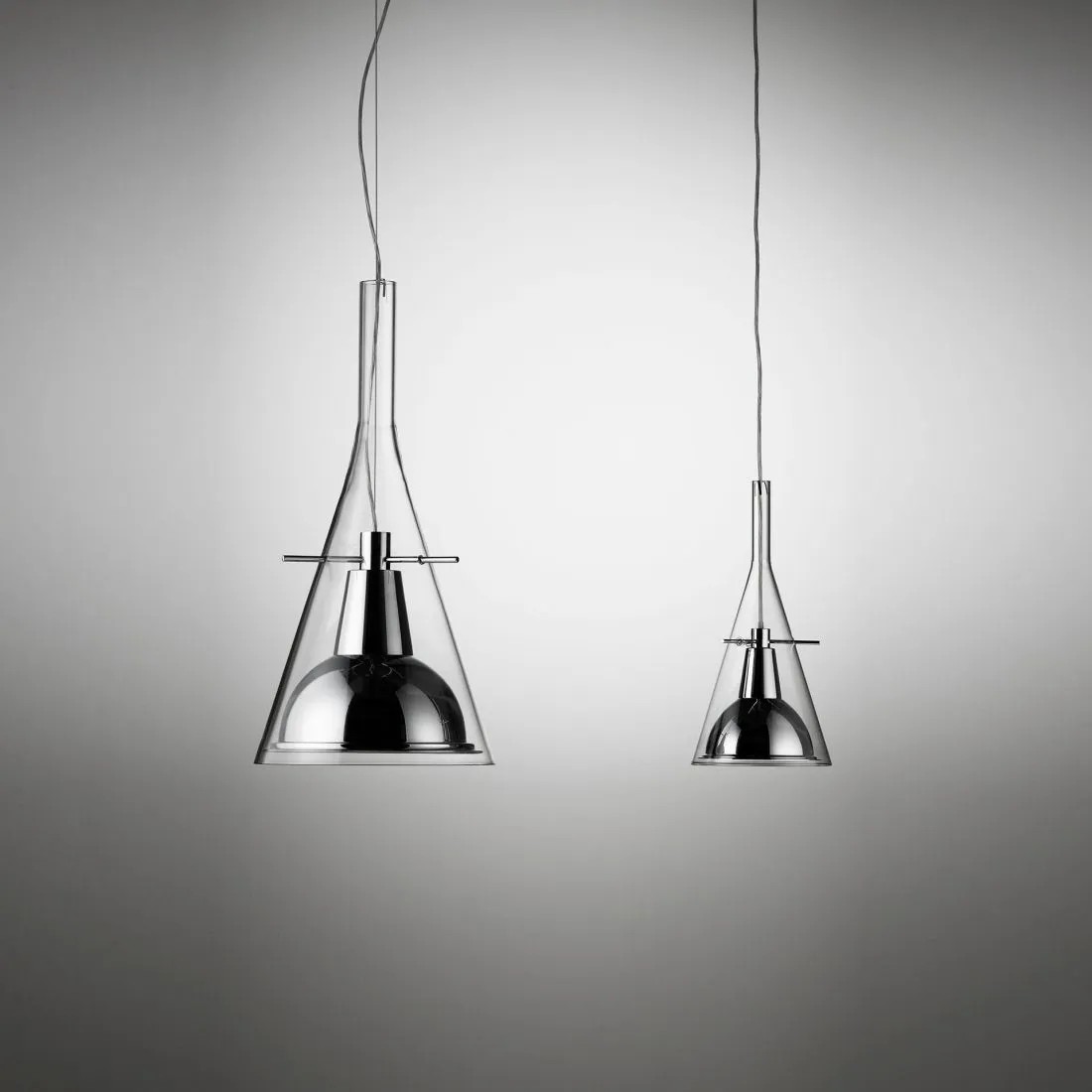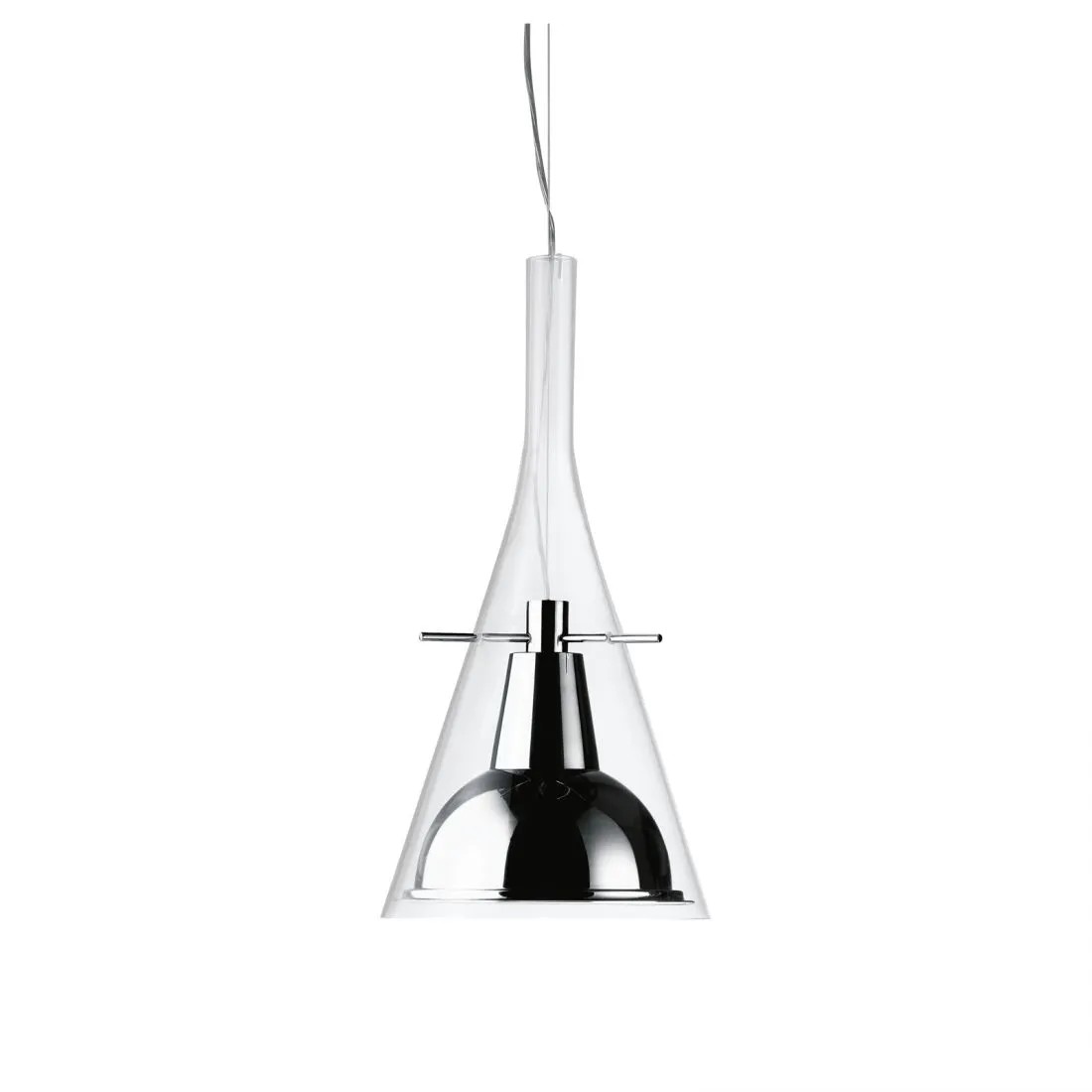 Un cono di vetro alloggia il riflettore in alluminio cromato, sorretto da tre aste sottili in metallo. Equilibrio e leggerezza per questa famiglia di lampade disponibili nella versione da terra e parete per una emissione di luce indiretta e a sospensione, per una emissione di luce puntuale e diretta.