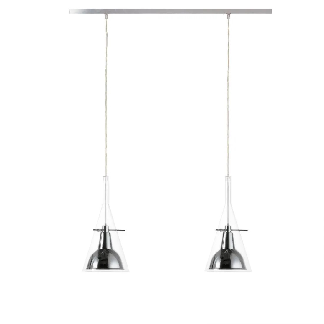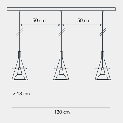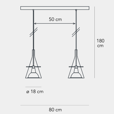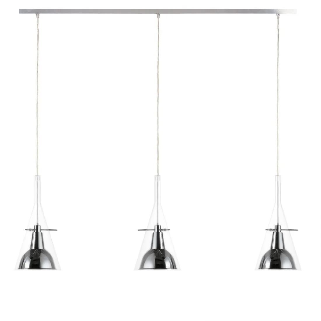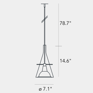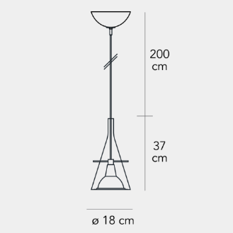 Un cono di vetro alloggia il riflettore in alluminio cromato, sorretto da tre aste sottili in metallo. Equilibrio e leggerezza per questa famiglia di lampade disponibili nella versione da terra e parete per una emissione di luce indiretta e a sospensione, per una emissione di luce puntuale e diretta.