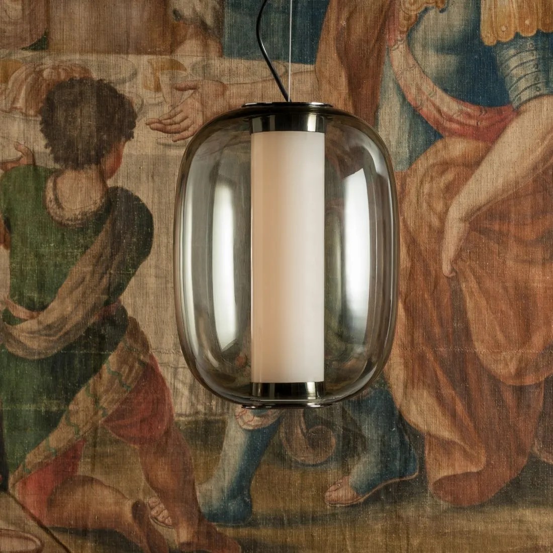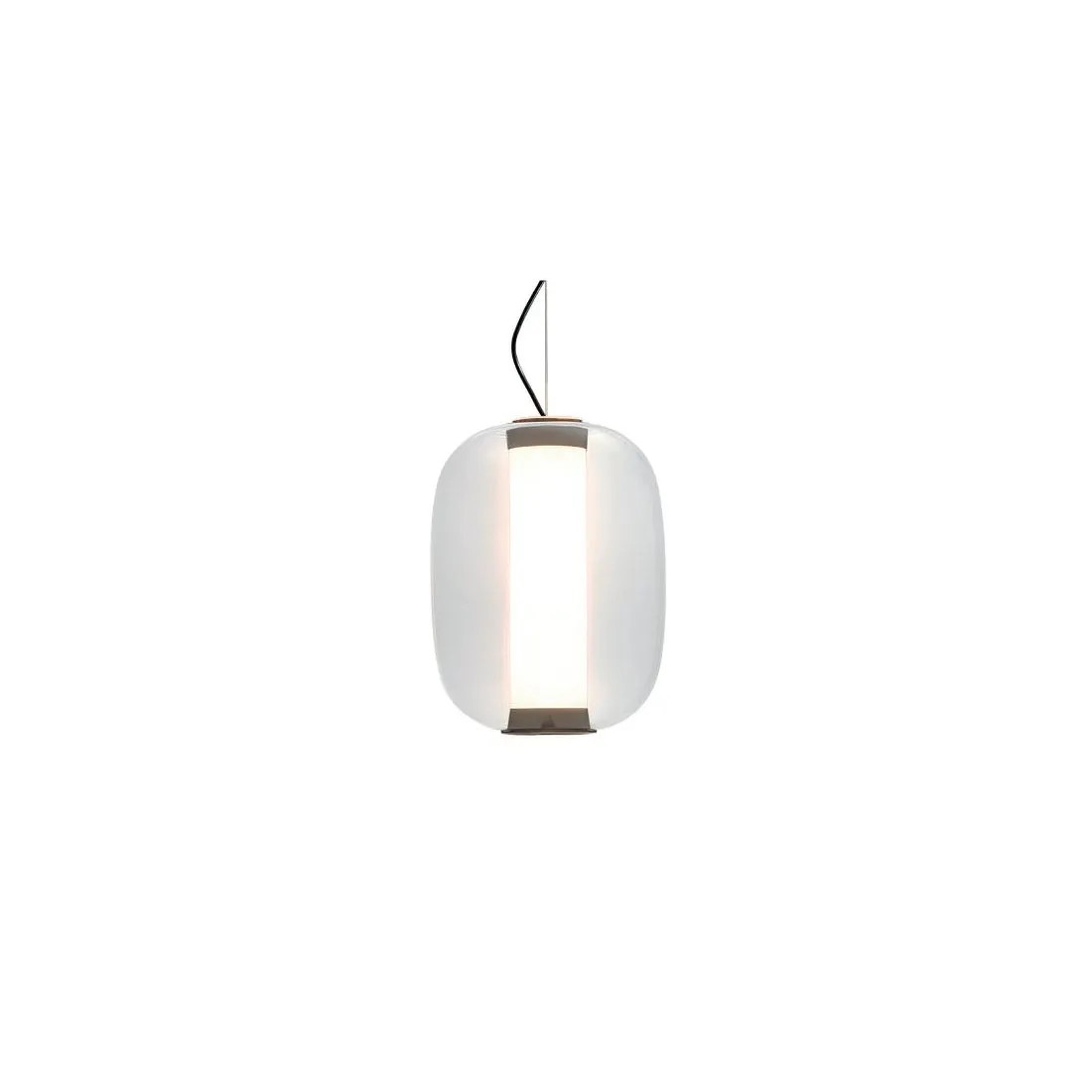 La “forma della luce” è il tema centrale di questo progetto di Gabriele e Oscar Buratti iniziato con la famiglia di lampade Equatore, presentata nel 2017 ed ora ampliata con altre finiture, fino alle nuove Meridiano e Tropico. Forme di vetro e metallo che raccolgono, contengono e diffondono la luce nello spazio. Passando tra layer opalini, colorati e trasparenti, enfatizzata dalle curvature ricercate e dalla magia dei vetri soffiati, la luce è libera di creare effetti, disegni ed atmosfere sorprendenti ed affascinanti. Nella nuova lampada Meridiano, il tubo cilindrico verticale contiene e diffonde la luce nella capsula di vetro trasparente, che ne definisce la ricercata forma ovoidale. Prevista in due misure, Meridiano è declinata come sospensione media e grande, da usare singolarmente oppure in composizione di multipli disposti a grappolo. La versione da tavolo è proposta nella misura media.