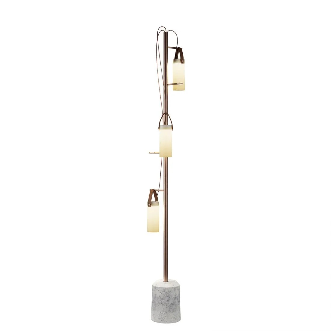 Il diffusore, soffiato in quattro strati di vetro in cui l’esterno e l’interno sono di due diversi colori, viene letto come bianco da spento, ed ambra una volta acceso. E’ inoltre provvisto di una fascia in cuoio che permette all’apparecchio di essere appeso in diverse posizioni alla struttura. Nella versione da terra, la lampada è disponibile per due utilizzi: da lettura con un diffusore, per ricreare un’atmosfera ideale per leggere, da terra, con tre diffusori posizionati ad altezze diverse, per una illuminazione diffusa di ambiente. La famiglia si declina anche in una versione da parete. La varietà dei materiali (vetro, cuoio, metallo e marmo) accostati in modo inedito in una lampada, rende questa famiglia particolarmente ricca e, al contempo, elegante ed equilibrata. Galerie esprime in chiave contemporanea un oggetto che riporta la memoria ad altri tempi.