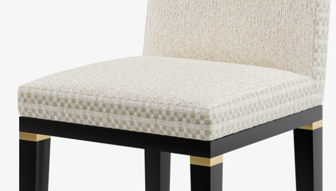 The AZZURE bar stool conveys a desirable art deco vibe thanks to its carefully selected palette. The upholstery blends lavish velvet with a fashionable tweed, while the legs and frame fuse gleaming brushed brass with glossy black lacquer, all to dramatic effect.