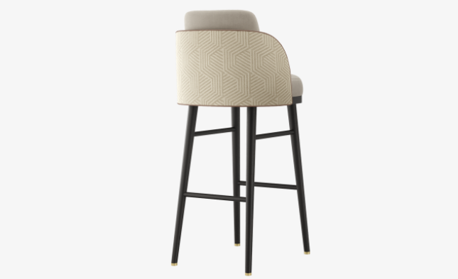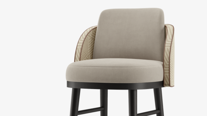 The elevated design of the PALMA bar stool plays with different upholstery, contrasting a plush velvet seat with a distinctive graphic fabric across the back.