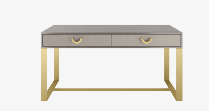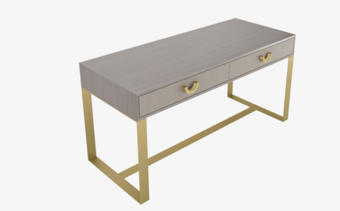 The ALCANTARA desk means business. It consists of a rectangular wood veneer box, which contains two drawers that are embellished with leather fronts and semi-circular metal handles. This rests on an impressive base constructed from seamless ribbons of brushed brass.