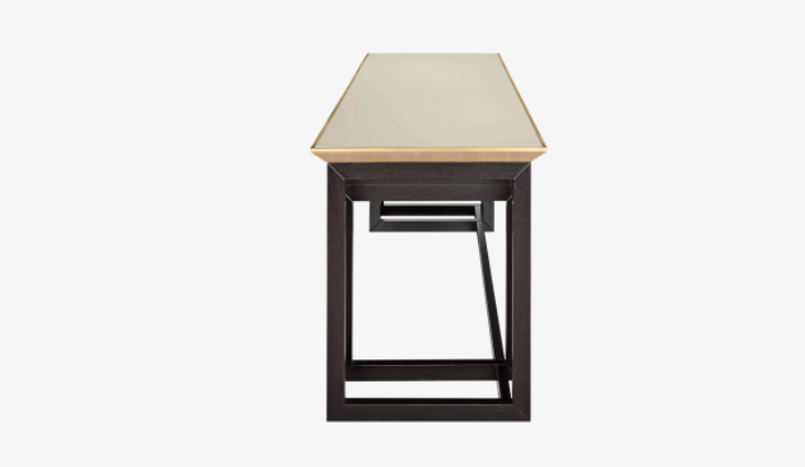 A design worthy of future heirloom status, the BALI desk is a sophisticated home office solution. Notice how the sculptural dark wood base showcases twin suede-lined drawers and a surface finished in textured leather and brushed brass.