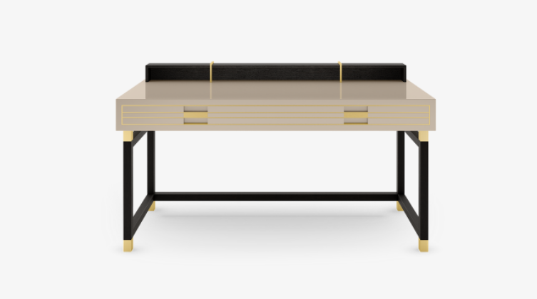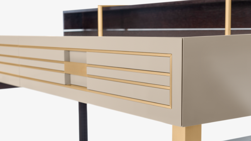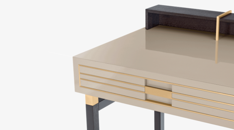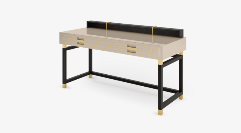 Touching on Art Deco design, the EDINBURGH desk features brushed brass inlays set into the glossy wood. The roomy top and multiple shelves leave plenty of space for productivity.