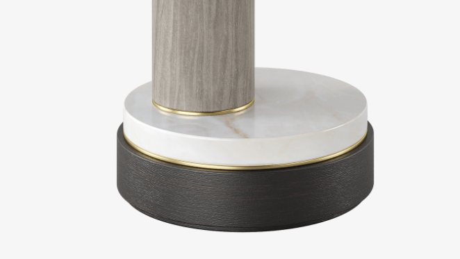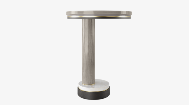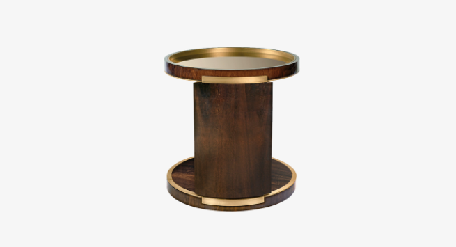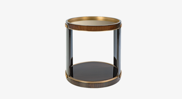 A rich mix of glossy dark wood veneer and opulent brushed brass, the drum-shaped BARI side table takes things up a notch by incorporating a bronze mirror surface. This will artfully reflect anything placed on top, while an open shelf provides ample storage below.