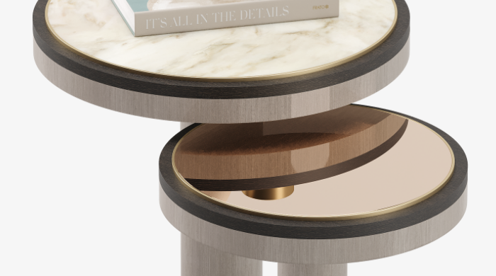 The simple, chunky pedestal form of the CALGARY side table focuses the attention on the beauty of the expertly layered materials, which include stone, brushed brass and contrasting shades of wood veneer. Place alongside a sofa or use as a pared-back bedside companion.