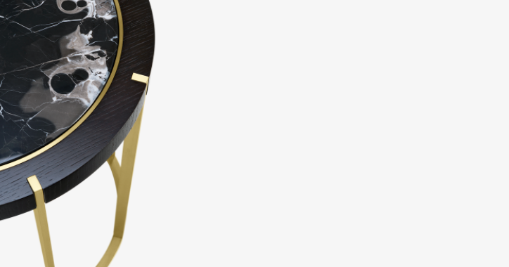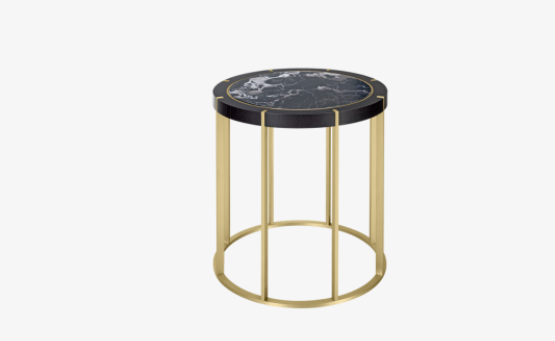 The drum-shaped design of the PRAGUE side table features a circular metal base and eight slimline legs. These slice though the outer edges of the surface, which features a stone centre surrounded by rings of metal and wood veneer.