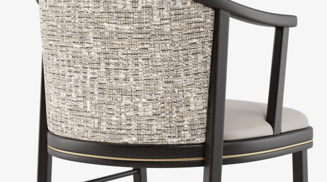 The first thing you notice about the stunning FUJI dining armchair is its free-flowing silhouette, which is dramatically outlined in dark solid wood. This flawlessly frames subtly different upholstery fabrics while accents of slimline brushed brass complete the look.