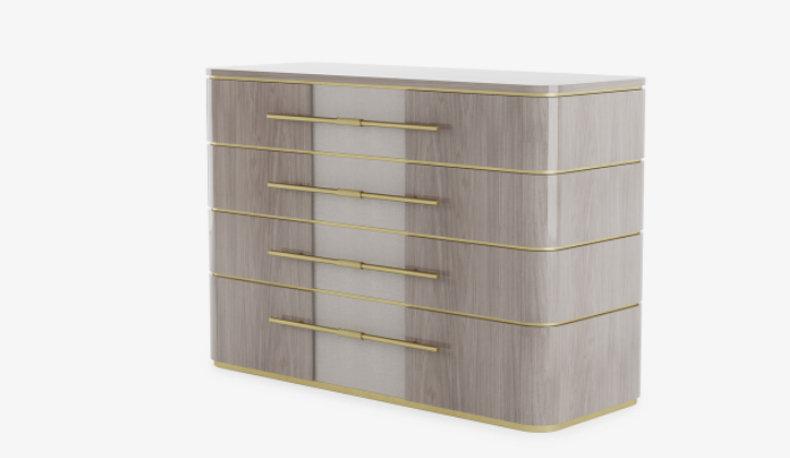 Crafted from wood veneer, the AGRA Chest of Drawers tempers its solid-looking silhouette with brushed-brass accents, elongated handles and panels of tactile leather. Ensuring a superior finish, it’s six drawers are internally lined with super-soft suede.