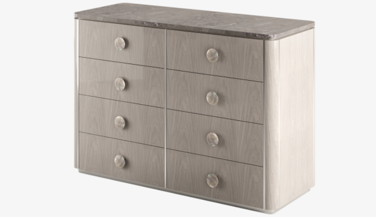 "Grey tones bring harmony to a variety of patinas that make up the archetypal BERNA Chest of Drawers. Blending veined wood veneer with a variegated stone surface and black mother-of-pearl handles, its silhouette is underscored with accents of polished stainless steel. "
