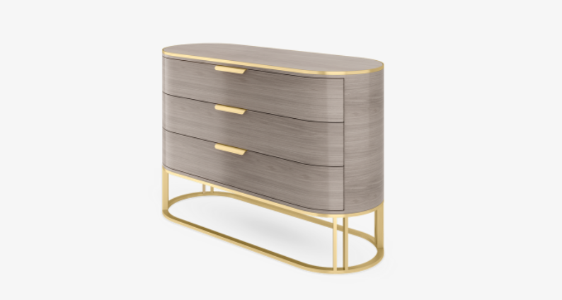 A gently curved oblong shape, the sinuous DALLAS chest of drawers design is crafted from high-gloss veneer with accents and an architectural base in contrasting brushed brass. Its three drawers feature simple pull handles and open to reveal suede-lined interiors.