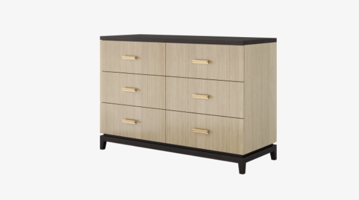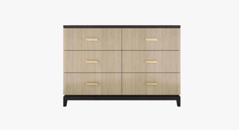 The chic LAGOA Chest of Drawers incorporates six generous drawers, each lined in soft suede and embellished with distinctive brushed-brass handles. Fashioned from wood veneer, a darker tone across the base and the surface adds contour to the design.