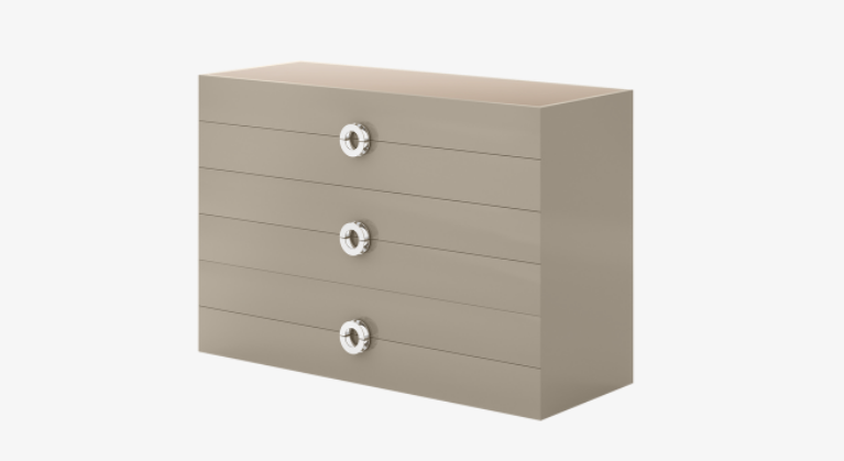 Part of a three-piece bedroom collection, the box-shaped SOHO chest of drawers is seamlessly crafted from glossy lacquered wood. Adding flair to its simple silhouette are distinctive O-shaped handles in polished metal and a surface of bronze mirror.
