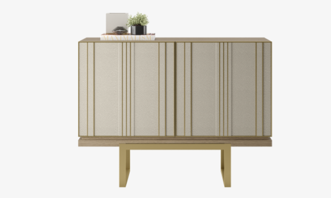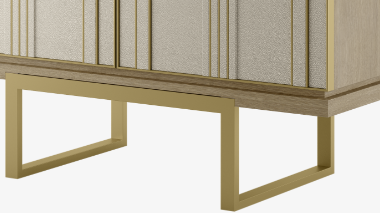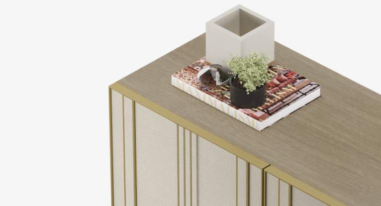 The ASCOT Cupboard channels the aesthetics of Brutalist architecture which is characterised by its use of rigid geometrics and blocky forms. Neat brass stripes placed at irregular intervals add an unexpected rhythm to the front of the wonderfully urbane Cupboard.